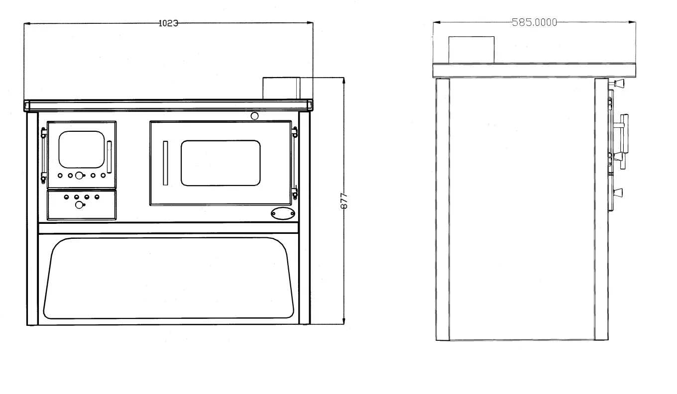 Il forno è un vero e proprio “forno a legna”, dotato di termometro direttamente su vetro, efficiente e funzionalissimo, Il vetro della camera di combustione è di tipo ceramico, resistente al fuoco diretto. La camera di combustione è in pietra refrattaria da 3cm, con piastra sul fondo in ghisa da cui scende la cenere nell’apposito cassetto. L’uscita fumi superiore è di 130mm, si può adattare con tubi da 120mm